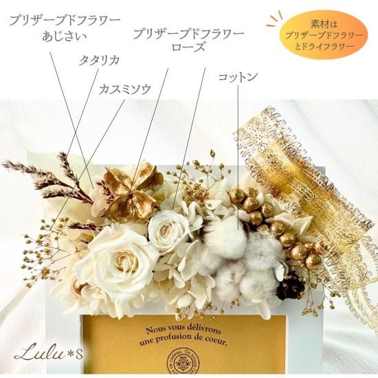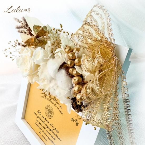 贈り物として、心を込めたメッセージを届けたい方へ―― 「コットンブロッサム・エレガンスフレーム」は、ホワイトローズやプリザーブドフラワー、ふんわりと柔らかいコットンボール、そして繊細なゴールドの装飾をあしらった高級感あふれるフレームです。包み込みます。 ナチュラルな色合いと華やかなゴールドのアクセントが調和し、お部屋に温もり上品な輝きを添えます。 コットンの柔らかさと白いバラが、優雅でありながらありそうな印象を演出し、大切な思い出やメッセージを一層このフレームは、感謝の気持ちを込めたギフトとして、また特別な空間を彩るインテリアアイテムとしてご利用いただけます。 高品質な素材と繊細な手作りで作り上げられたこのフラワーフレームは、永くお楽しみいただける一品です。結婚祝いや誕生日、記念日など、さまざまなシーンで特別な贈り物としてご利用いただけます。