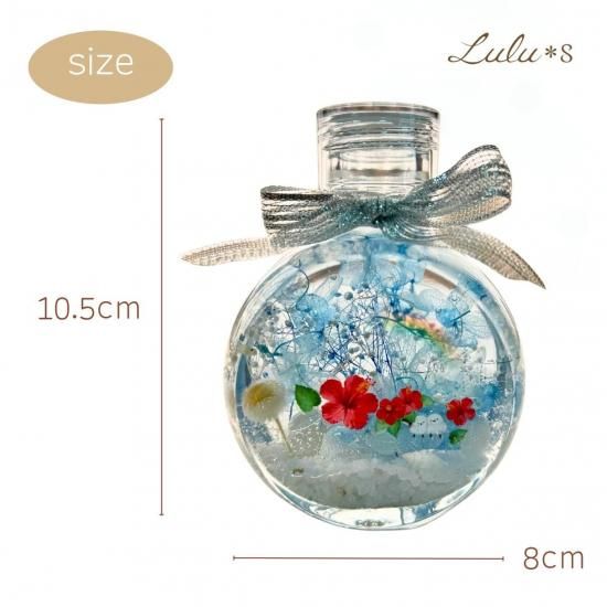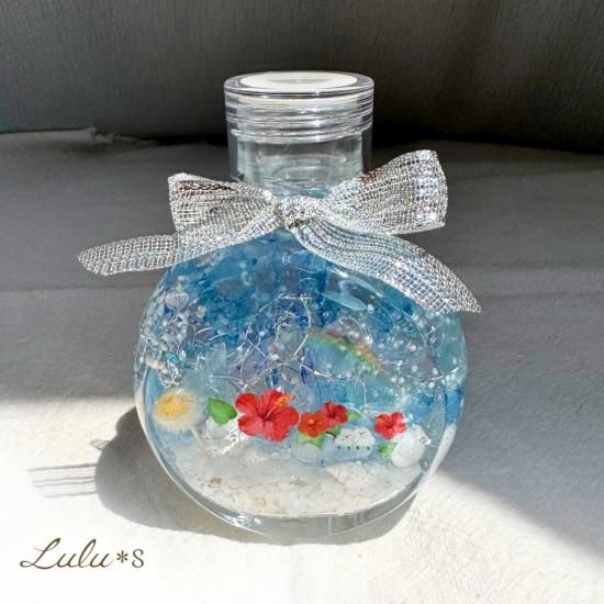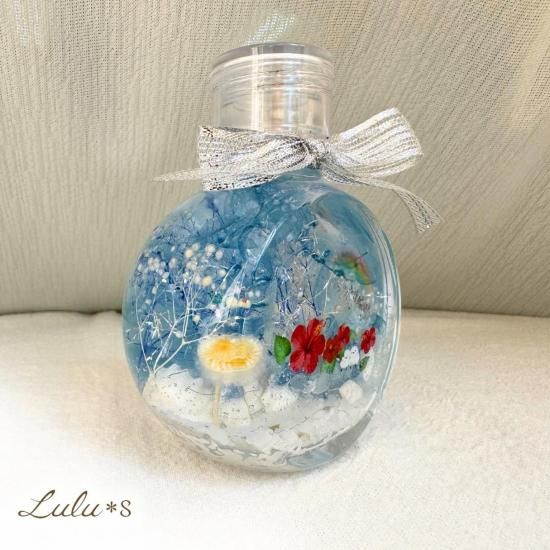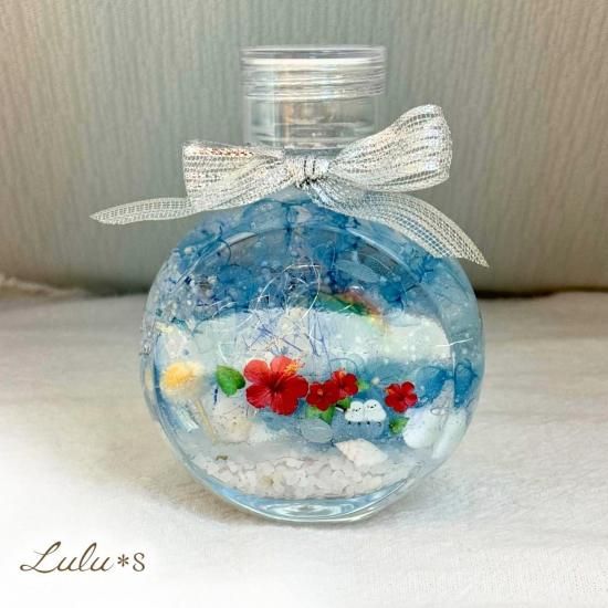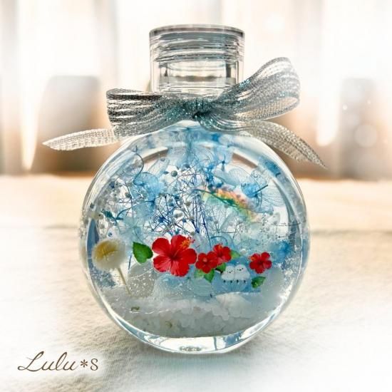 ハイビスカスをモチーフにした華やかなデザインのハーバリウム。透明感あるオイルの中で鮮やかな花材が映え、夏らしい涼しさを演出します。