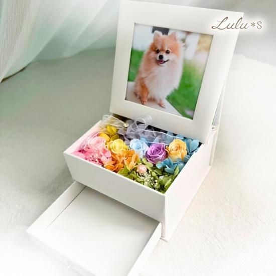 愛するペットとのかけがえのない日々を、美しい虹色の花々でそっと包み込むメモリアルボックスです。