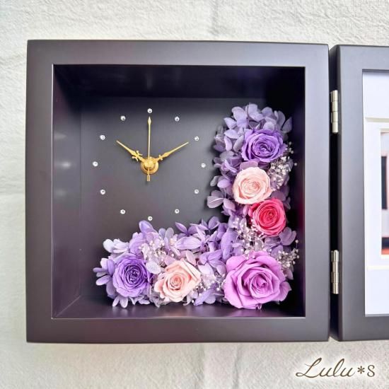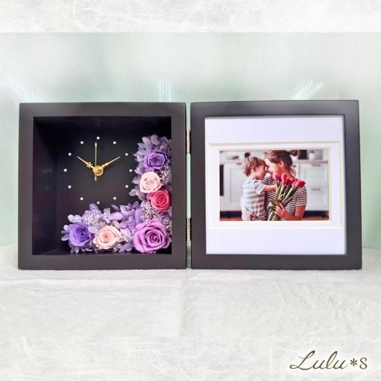 パープルとピンクの薔薇が咲く上品な花時計とフォトフレーム 大切な時と想い出を彩る贈り物に最適な高級感あるフラワーギフト